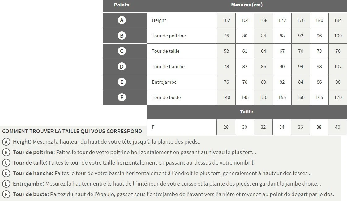 F 28 30 32 34 36 38 40 UK/USA 22 24 26 28 30 32 34 IT 32 34 36 38 40 42 44 D 26 28 30 32 34 36 38 AUS 0 2 4 6 8 10 12 chest /poitrine 79-84 84-89 89-94 94-98 98-102 102-106 106-108 waist/taille 62-66 66-70 70-74 74-78 78-82 82-86 86-88 hips/hanches 80-85 85-90 90-95 95-100 100-105 105-110 110-115 torso loops/boucle de torse 136-143 146-153 156-163 166-173 171-178 176-183 181-186             Â